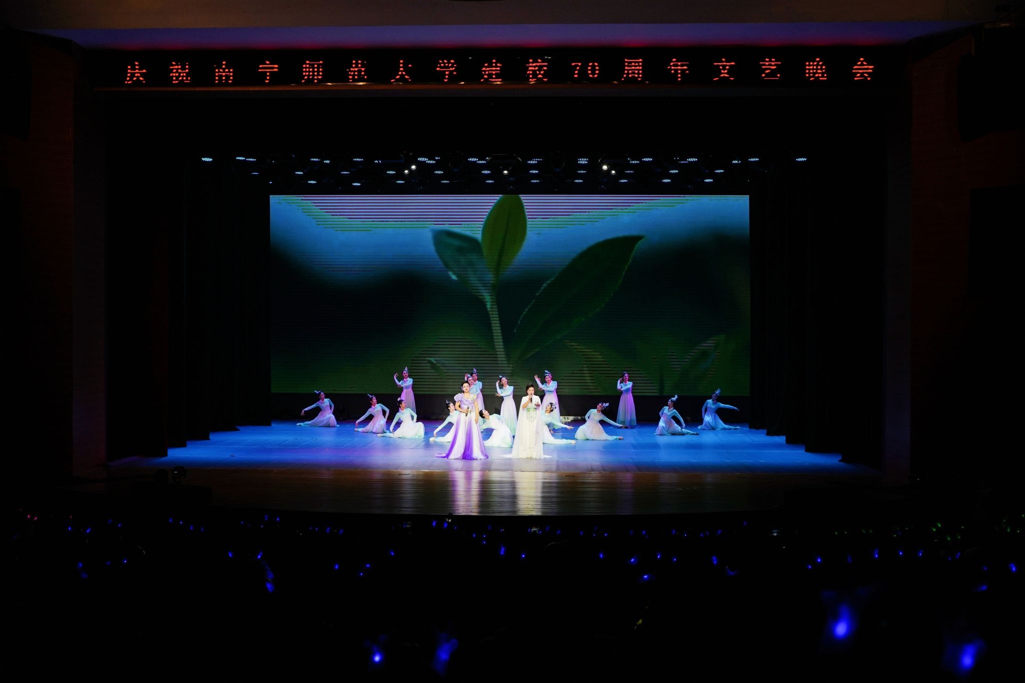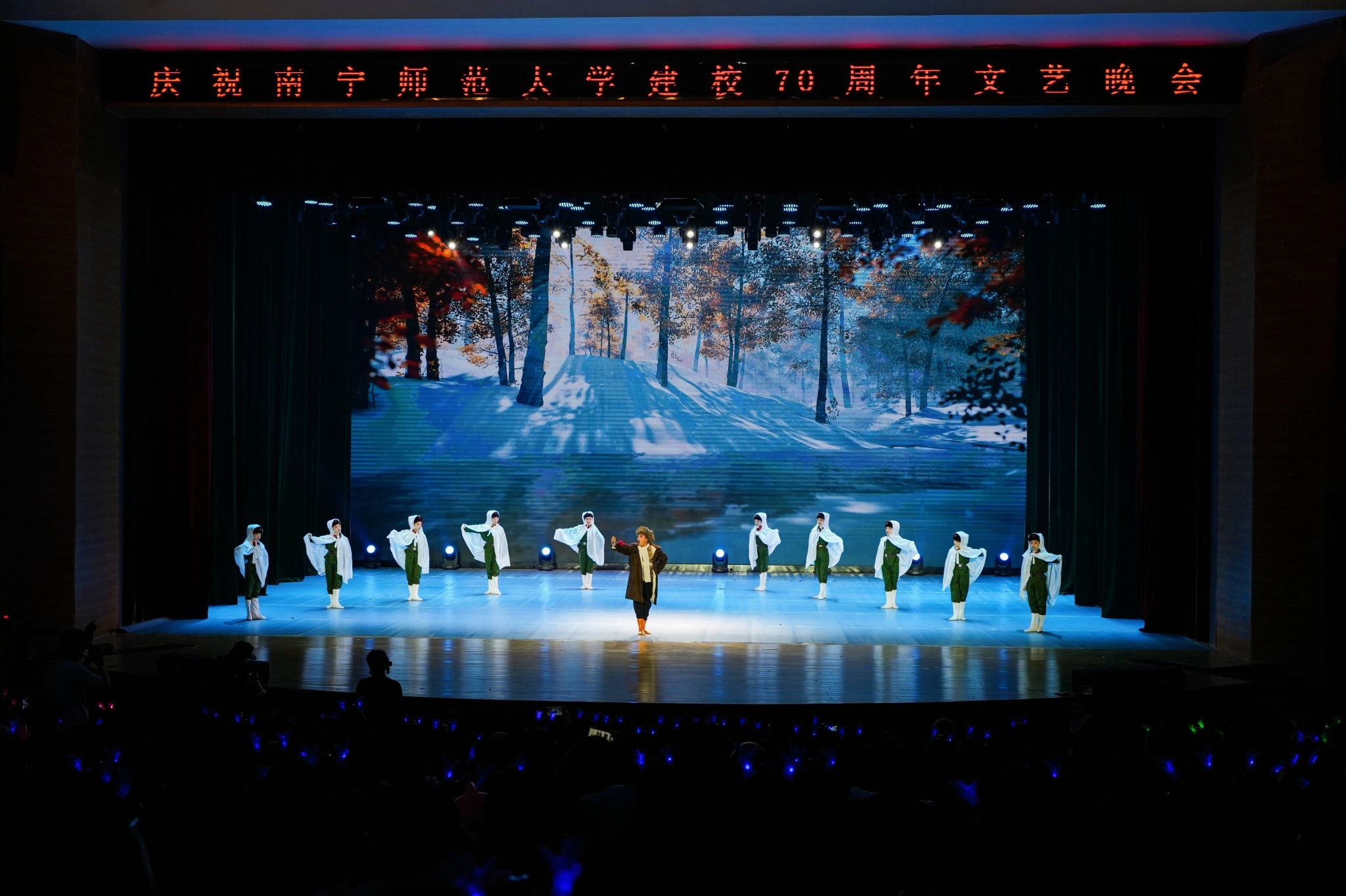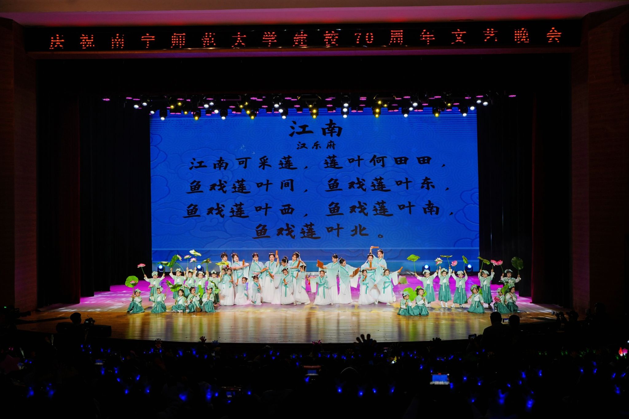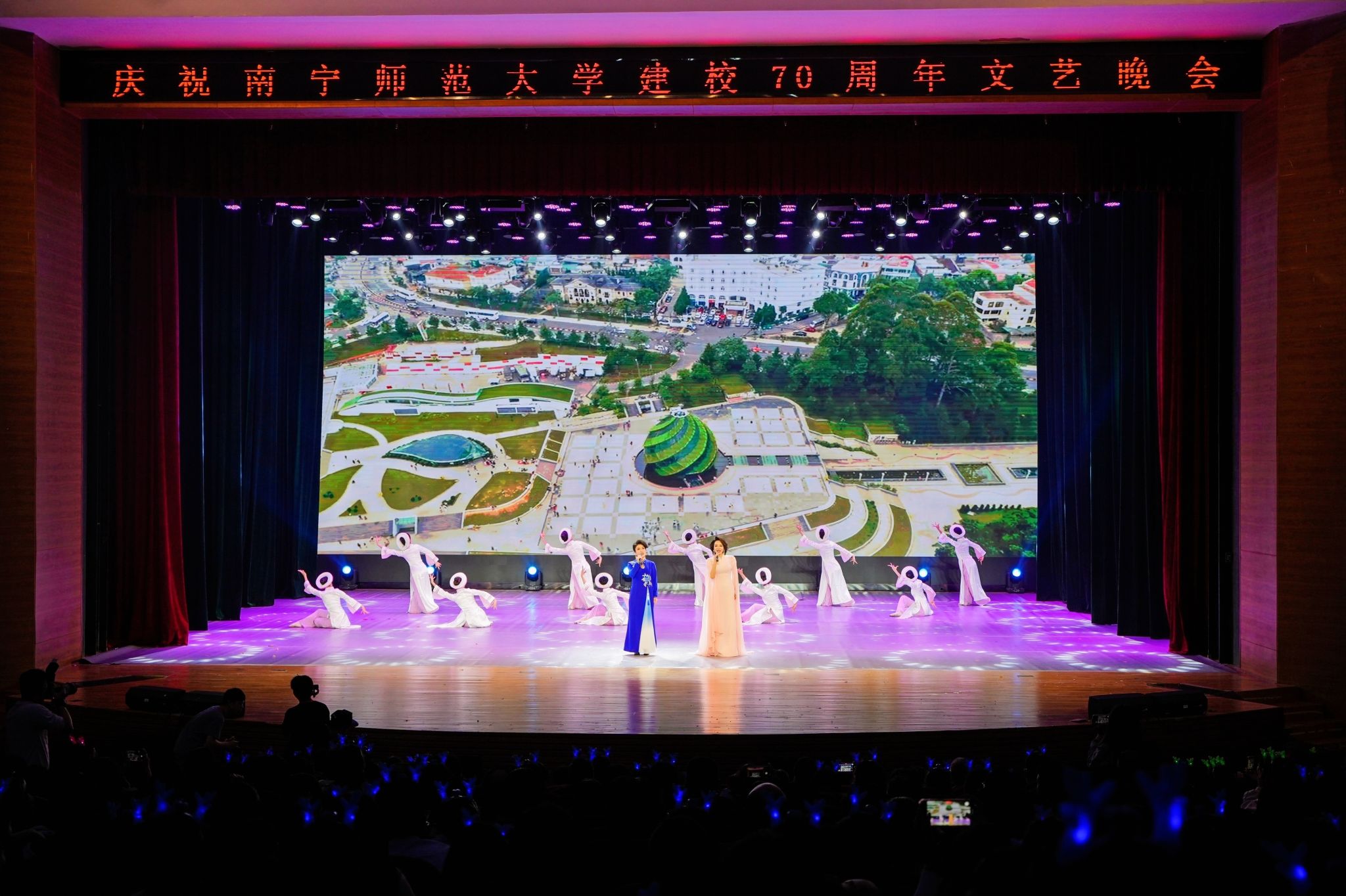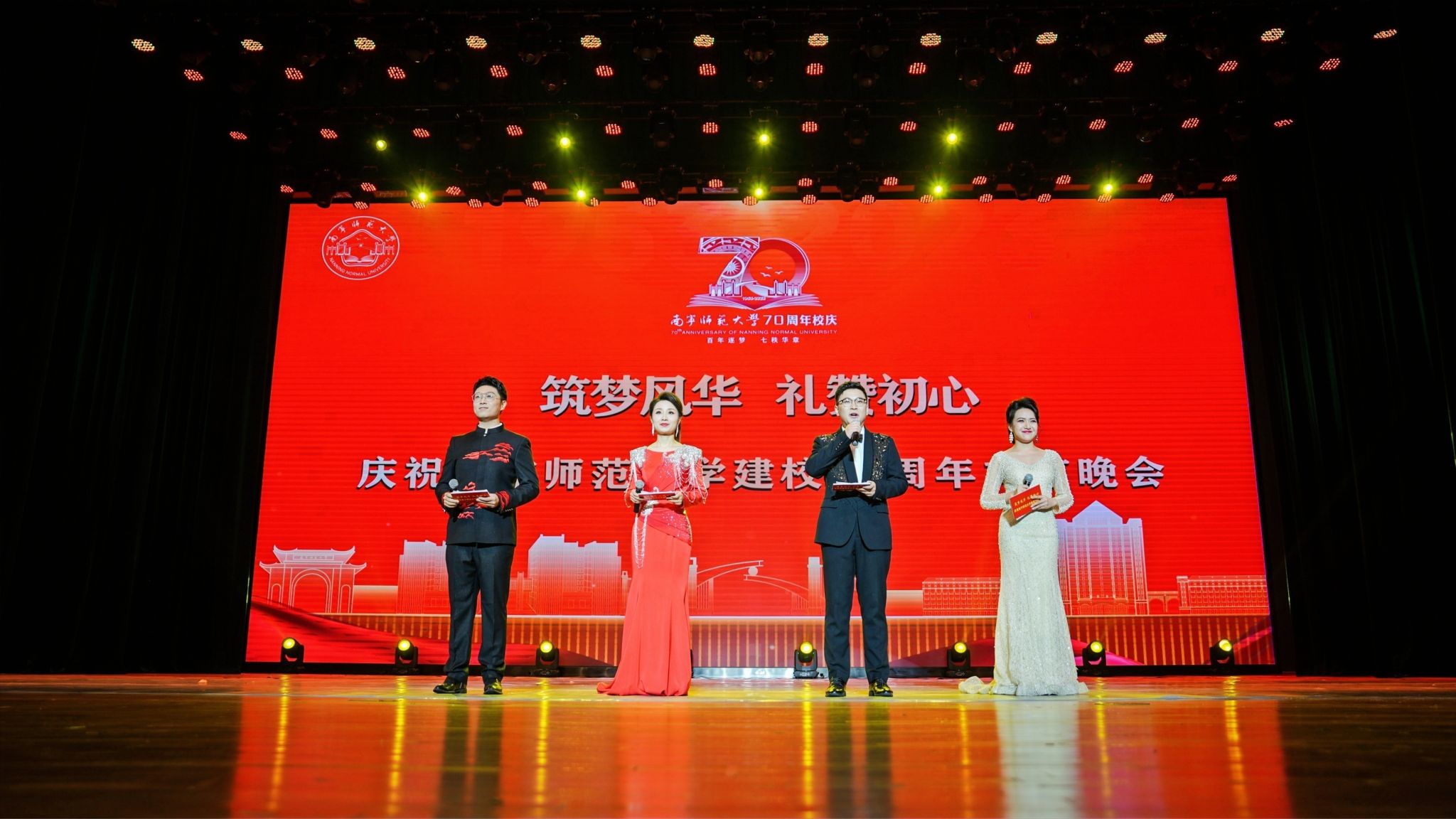 南师七秩谱芳华,今夜同歌庆华诞。12月30日晚,庆祝问鼎在线建校70周年校庆文艺晚会在武鸣校区音舞楼1号报告厅举行。问鼎在线原党委书记莫诗浦,韩国世翰大学总长李昇勋,淮北师范大学副校长高玉兰,问鼎在线党委书记李丰生、党委副书记隆广庆、副校长龙妮娜,各界嘉宾、校友以及师生代表到场观看,共庆问鼎在线七秩华诞。