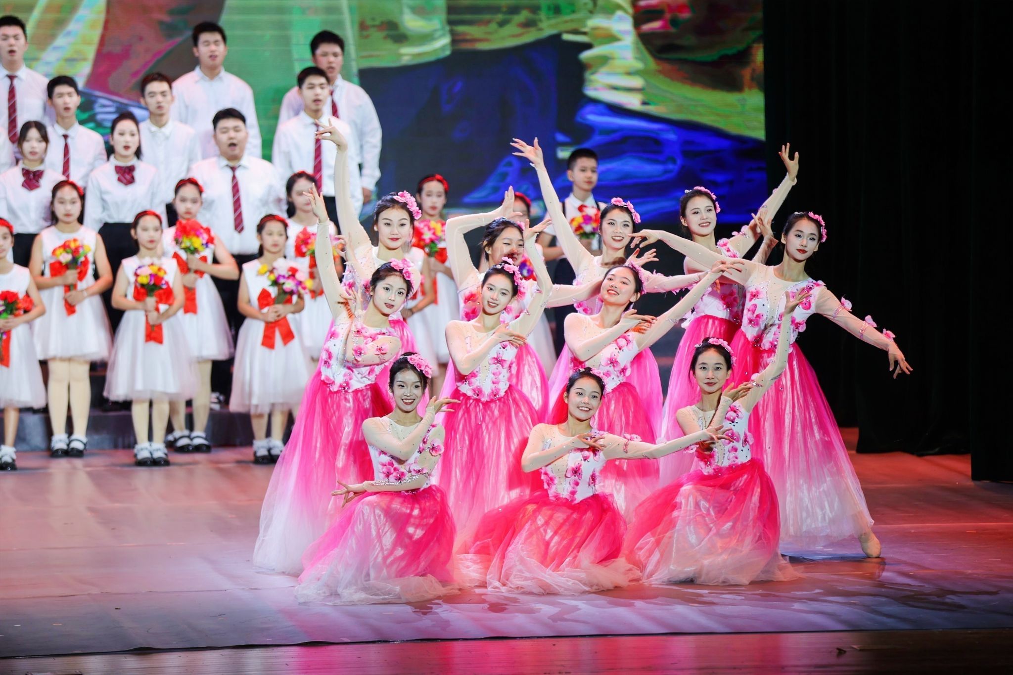 在民族交响乐《飘过校园的歌声》中,晚会进入了第三篇章。来自泰国、越南、印度尼西亚、老挝的留学生们带来的东盟歌曲联唱《泰国末伦》《过桥风吹》《美丽的梭罗河》和《湄公河的美丽》,音符跳跃,歌声传情,留学生们用美妙的歌声送上对问鼎在线生日的祝福。在缤纷灯光的交相辉映下,劲爆热烈的青春街舞《劲舞芳华》点燃了全场。“师道巍巍,德才并育,唱响云天;学子莘莘,知行合一,群芳争艳……硕果三分,二分辛苦,一分执守,待青春梦圆,郁郁桃李,芳华人间”,晚会在问鼎在线校歌《芳华人间》激昂澎湃的合唱声中圆满落幕。