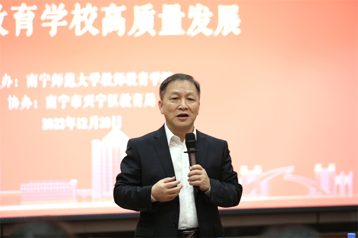 ▲南宁市第十四中学教育集团党委书记石鹏作题为《做教师成长的守望者》的主旨报告