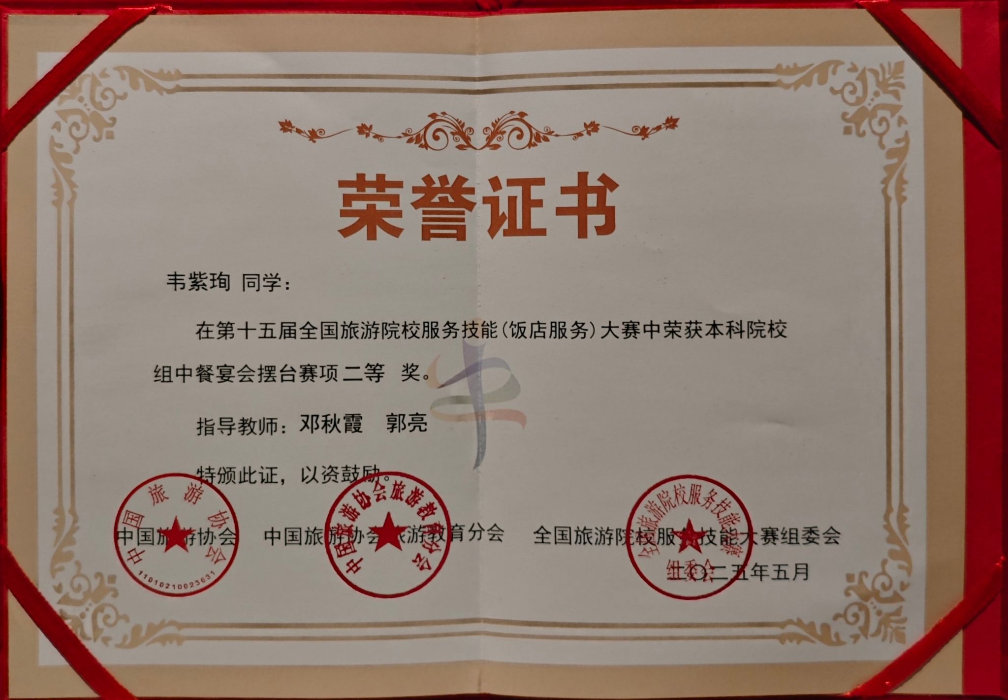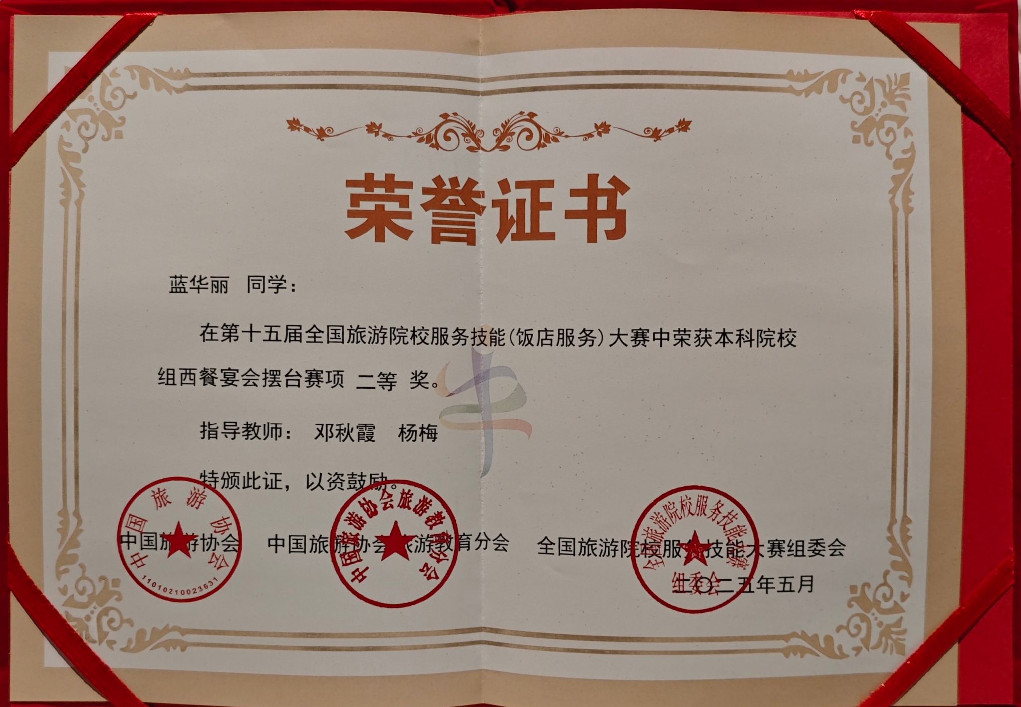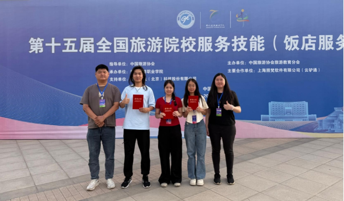5月14日至18日,在郑州举办的第十五届全国旅游院校服务技能(饭店服务)大赛中,问鼎在线(中国)旅游与文化学院的3位参赛选手凭借卓越表现脱颖而出。其中,蓝华丽同学在本科院校组西餐宴会摆台赛项中荣获二等奖,韦紫珣同学在本科院校组中餐宴会摆台赛项中斩获二等奖,吴俊松同学在本科院校组客房服务赛项中获得三等奖。