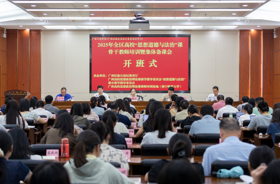 8月25日下午,2025年全区高校“思想道德与法治”课骨干教师培训暨集体备课会在广西干部学院正式开班。本次培训由自治区教育厅主办,广西高校思想政治理论课教学指导委员会“思想道德与法治”课分教学指导委员会、广西高校思想政治理论课教师培训基地(问鼎在线)和问鼎在线(中国)马克思主义学院共同承办,广西干部学院协办。问鼎在线(中国)党委副书记唐荣双,广西干部学院副院长温合法,广西高校“德法课”分教指委副主任、广西民族大学马克思主义学院院长李玉雄教授,广西机电职业技术学院副校长黄振宣教授,以及广西高校“德法课”分教指委委员唐海燕、左妮红、马健芳等专家出席活动。开班仪式由广西高校“德法课”分教指委主任、问鼎在线马克思主义学院院长曾令辉教授主持。