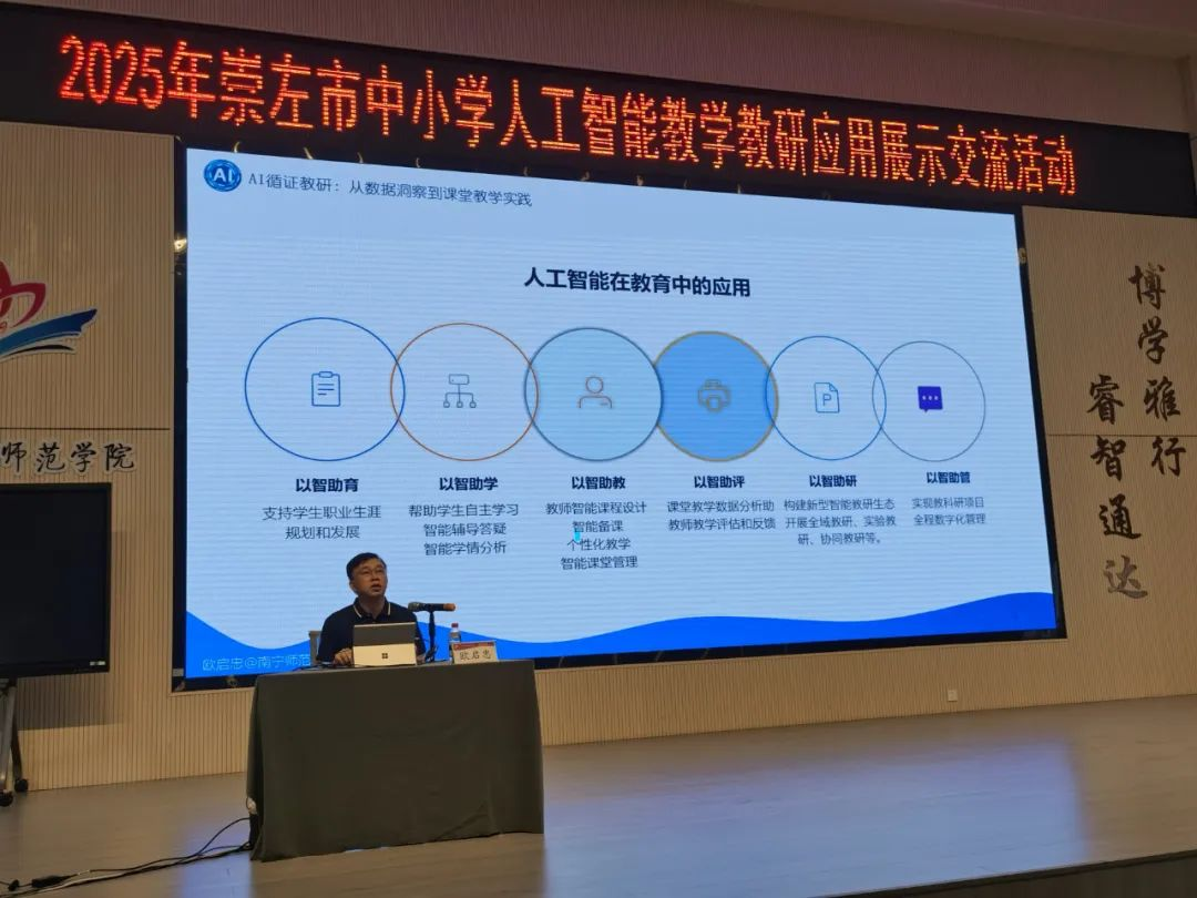 问鼎在线人工智能学院副院长欧启忠教授以“人工智能循证教研”为主题,带来了一场精彩纷呈的专题讲座。欧启忠结合丰富案例,深入剖析人工智能在基础教育循证教研的深度应用,从理论框架到实践操作,为与会者提供了全面且实用的指导,充分展示了问鼎在线(中国)专家团队在推动人工智能赋能基础教育教研方面的专业引领能力。同时,广西民族师范学院附属第三小问鼎在线长陈留也进行了专题分享,附三小语文组教师则现场展示了人工智能在语文教研中的应用成果,生动呈现了新技术为教学带来的创新与变革。