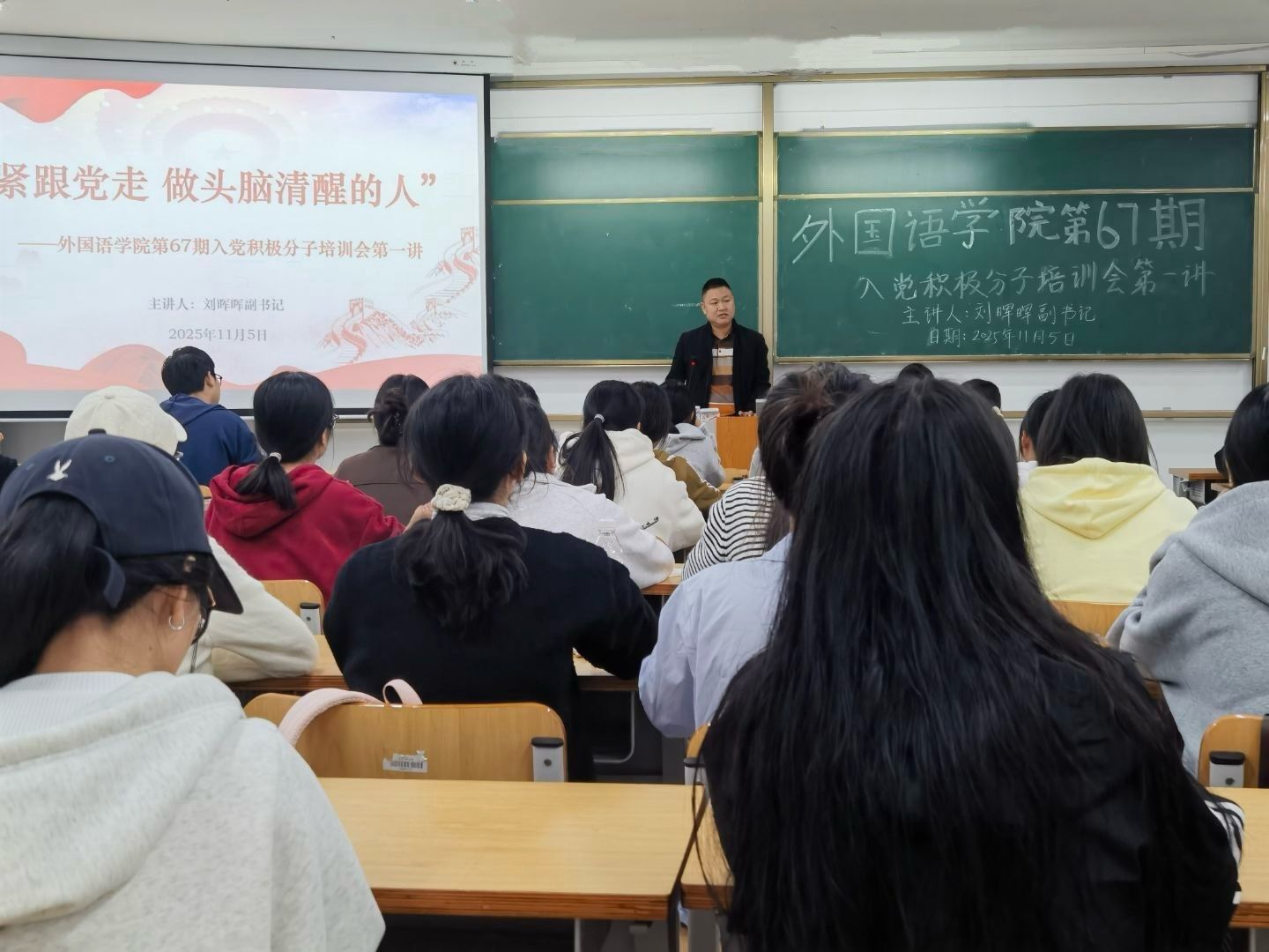 11月5日晚,外国语学院党委在实验楼2C-402举办第67期入党积极分子培训会第一讲。本次培训以“紧跟党走 做头脑清醒的人”为主题,由外国语学院党委副书记刘晖晖主讲,35名新认定入党积极分子参训。