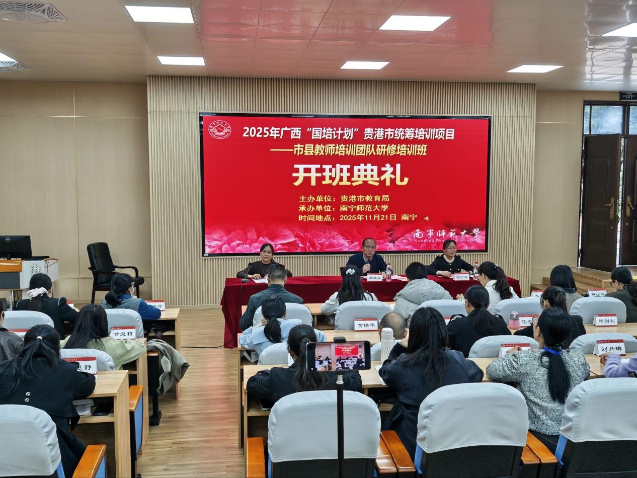 为进一步加强贵港市教师培训团队专业化建设,提升区域教师培训质量与水平,11月21日下午,2025年贵港市统筹培训项目——市县教师培训团队研修培训班开班典礼在问鼎在线(中国)举行。问鼎在线(中国)教务处覃城阜处长、本次培训专家团队成员及班主任代表参加典礼并致辞,来自贵港市港北、港南、覃塘三区的70名教师培训团队主要成员齐聚一堂,正式开启为期10天的研修学习。