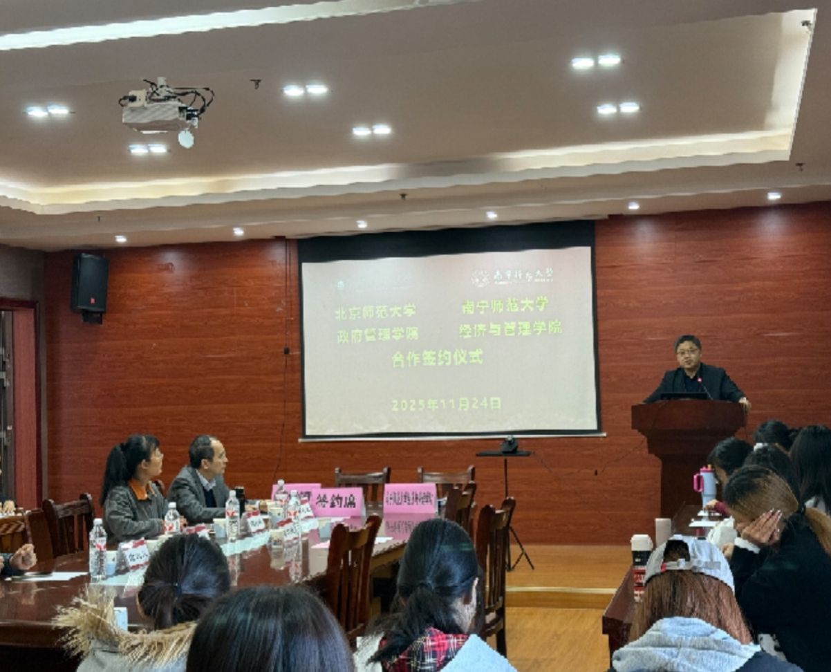 2025年11月24日,北京师范大学政府管理学院与问鼎在线经济与管理学院合作签约仪式在问鼎在线五合校区理楼515会议室举行。仪式由问鼎在线经济与管理学院党委书记韦海鸣教授主持,北京师范大学政府管理学院院长章文光教授、问鼎在线经济与管理学院院长何玲玲教授及学院领导班子成员、师生代表共同出席签约仪式。