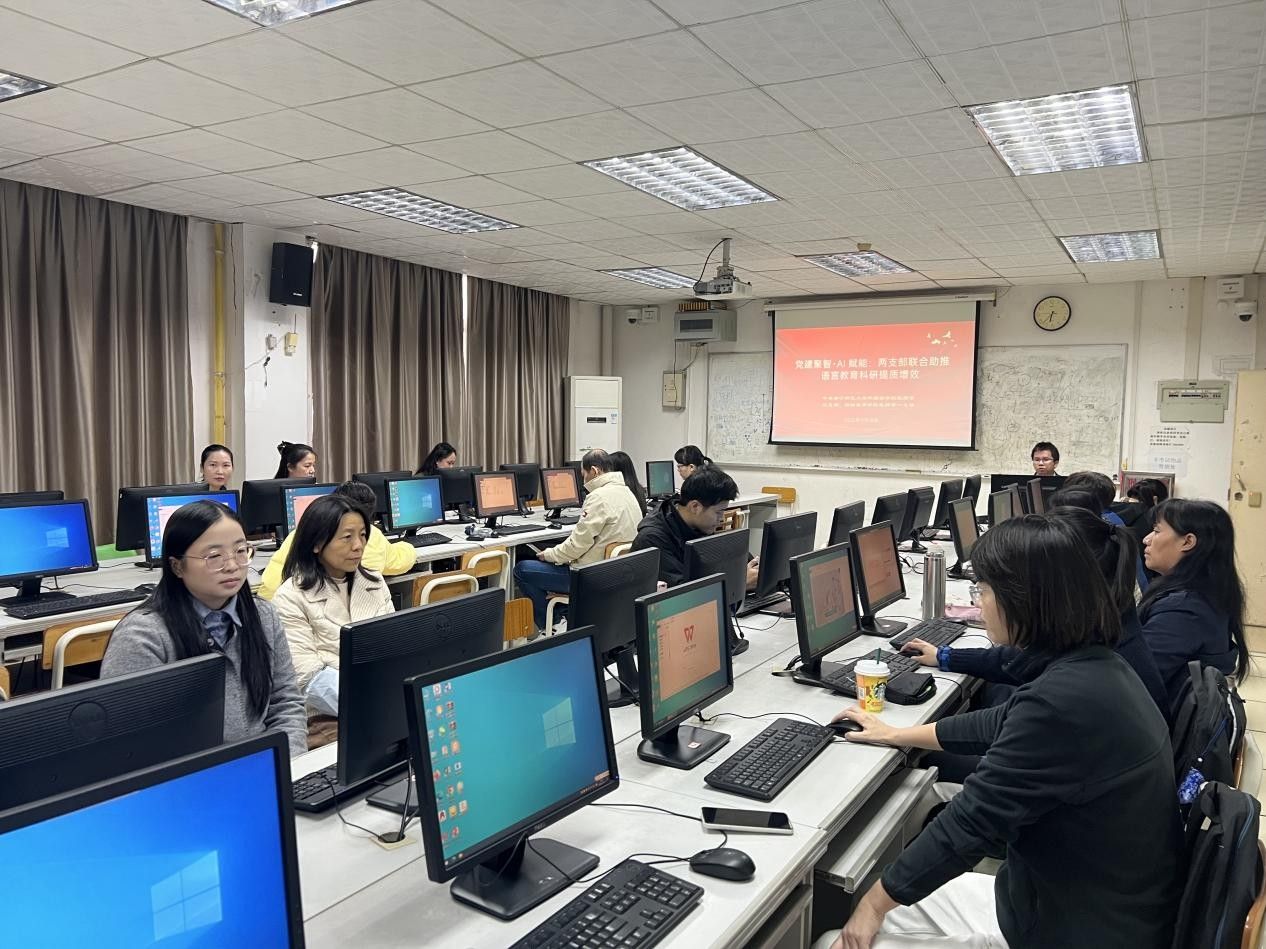 为深入推进党建与业务工作深度融合,着力破解语言教育科研中“技术应用难、资源整合散”的现实难题,11月18日下午,外国语学院教工第三党支部与国际教育学院教工第一党支部在问鼎在线明秀校区文星楼905机房联合开展“党建聚智·AI赋能:联合助推语言教育科研提质增效”主题党日活动。活动特邀问鼎在线(中国)人工智能学院覃开贤副教授进行专题讲授与实操指导,两个支部的全体党员及学院其他教师共同参与。