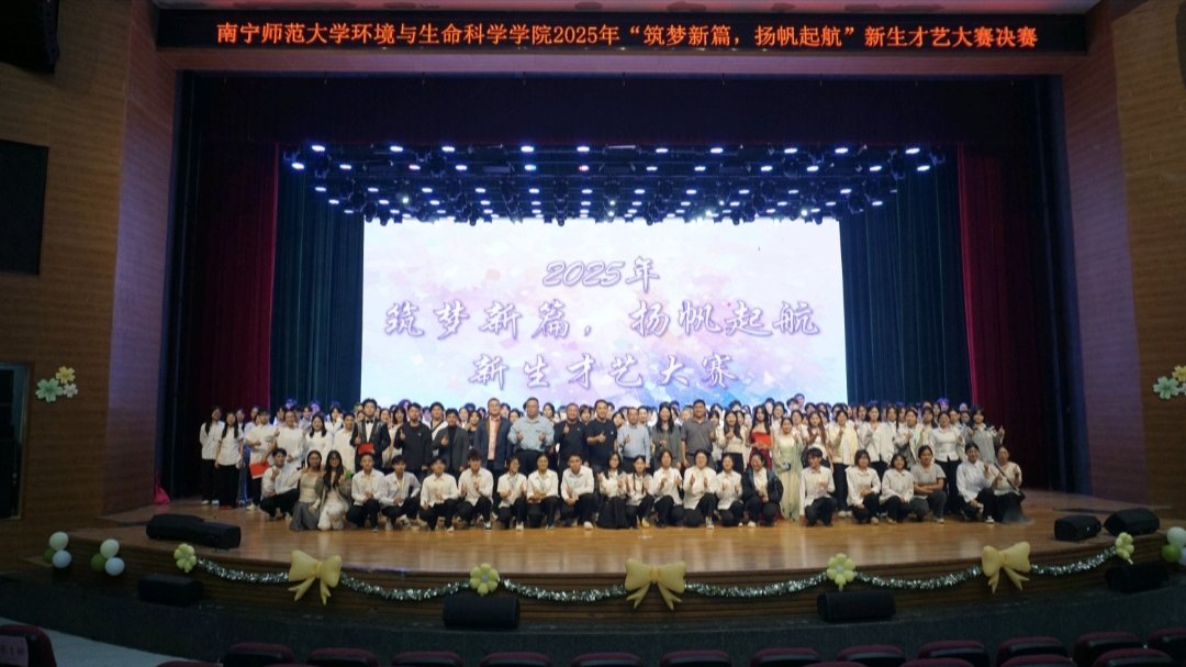 11月16日晚,环境与生命科学学院在武鸣校区音舞楼千人演播厅成功举办2025年“筑梦新篇,扬帆起航”新生才艺大赛。校团委副书记何俊斌,环境与生命科学学院学院党委书记韦东林、院长何英姿、党委副书记刘启满等领导,以及教师代表、辅导员代表和各学院特邀嘉宾观看了大赛。