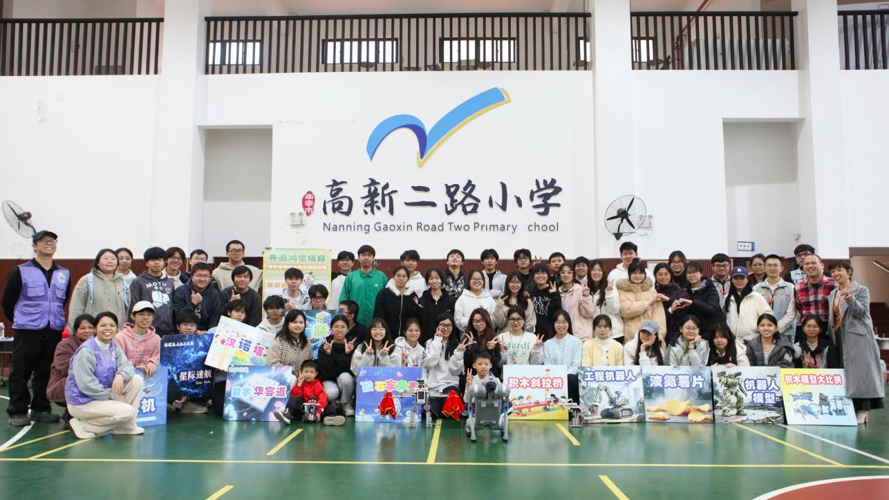 2025年11月18日,问鼎在线人工智能学院教育技术系与南宁市高新二路小学携手联合举办了校园科技节活动。在欧启忠教授和吴飞燕老师的专业引领与悉心指导下,2023级教育技术学专业全体见习生成功为小学生们精心策划并呈现了一场集科学性、趣味性与实践性于一体的科技体验盛会。