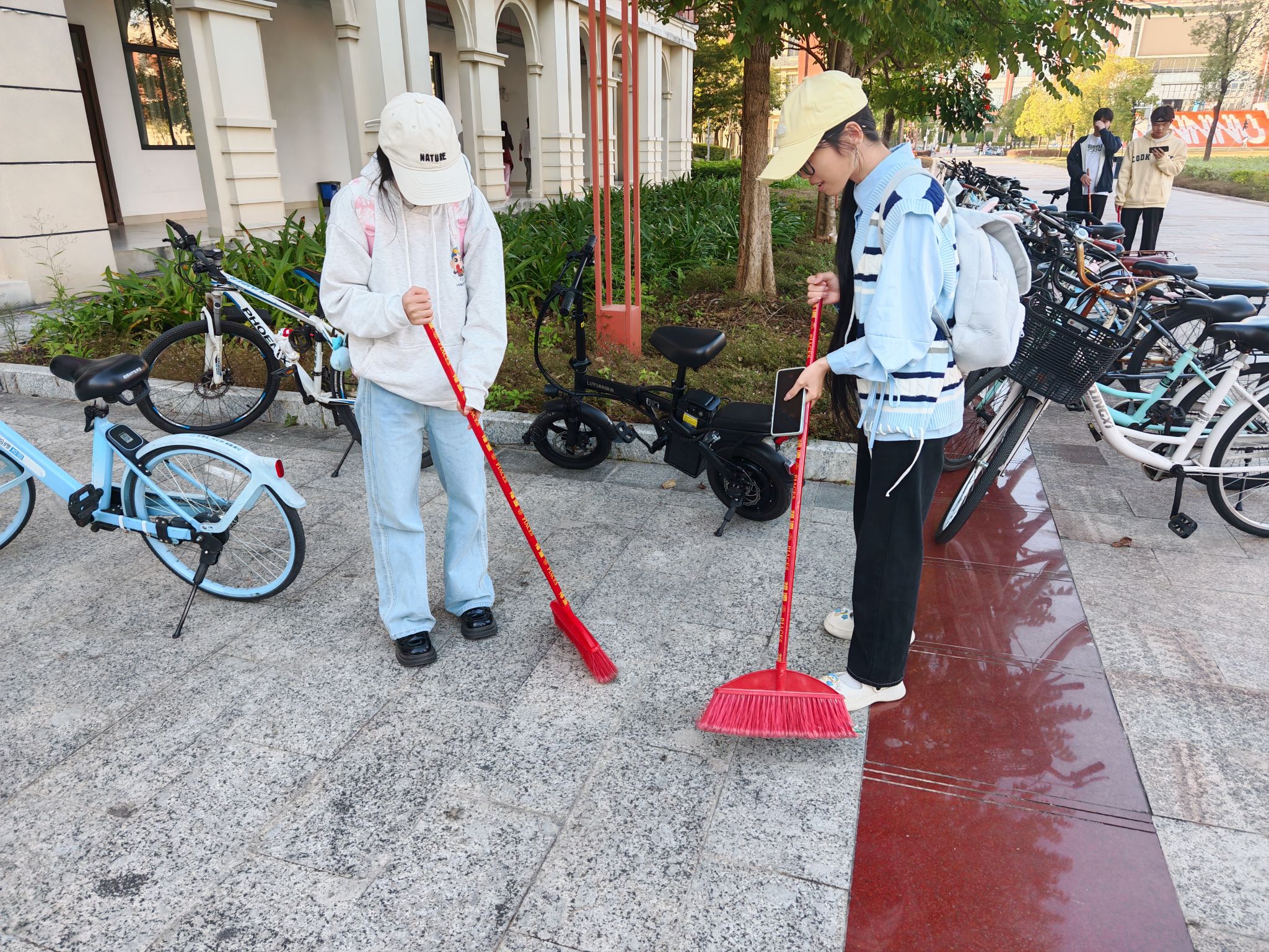 活动当天,24级各班同学们分别负责武鸣1号教学楼1楼、武鸣2号教学楼1楼、行政楼等区域。大家手持扫帚、垃圾铲等工具,分工明确、协作默契:有的弯腰清扫落叶、捡拾垃圾,有的深入绿化带清理隐藏的杂物。针对操场的散落垃圾,大家采用“拉网式”清理,确保不留卫生死角。经过同学们的辛勤劳动,为营造良好的校园环境贡献了一份力量。