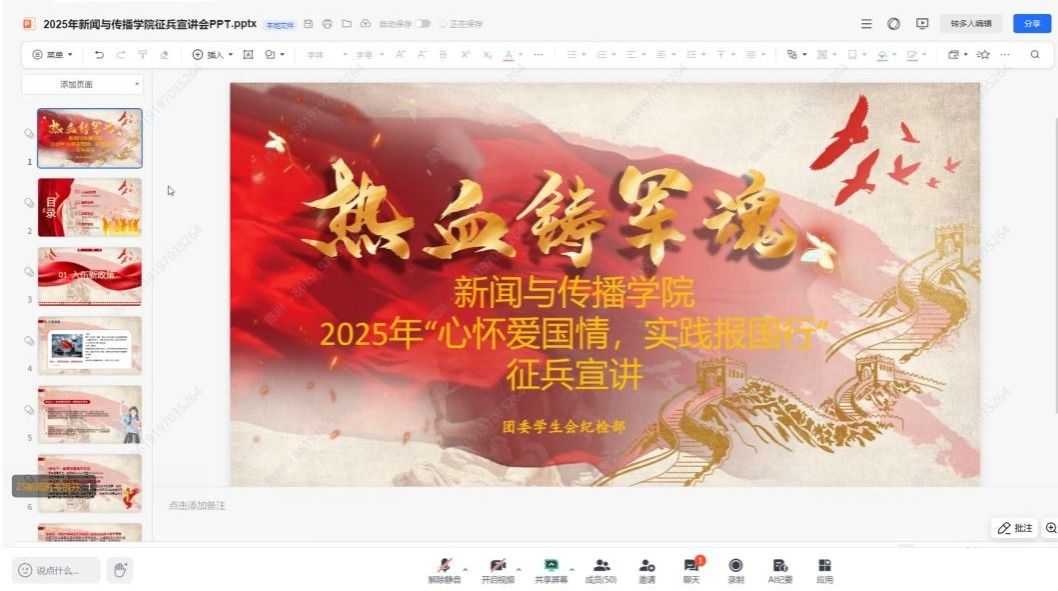 为推进征兵政策宣传,进一步激发爱国热情与报国志向,12 月 18 日晚,新闻与传播学院召开2025年下半年线上征兵宣讲会。学院辅导员覃力老师、2022级退役大学生莫昭炬同学以及 22-25 级全体男同学、部分女同学参加会议。