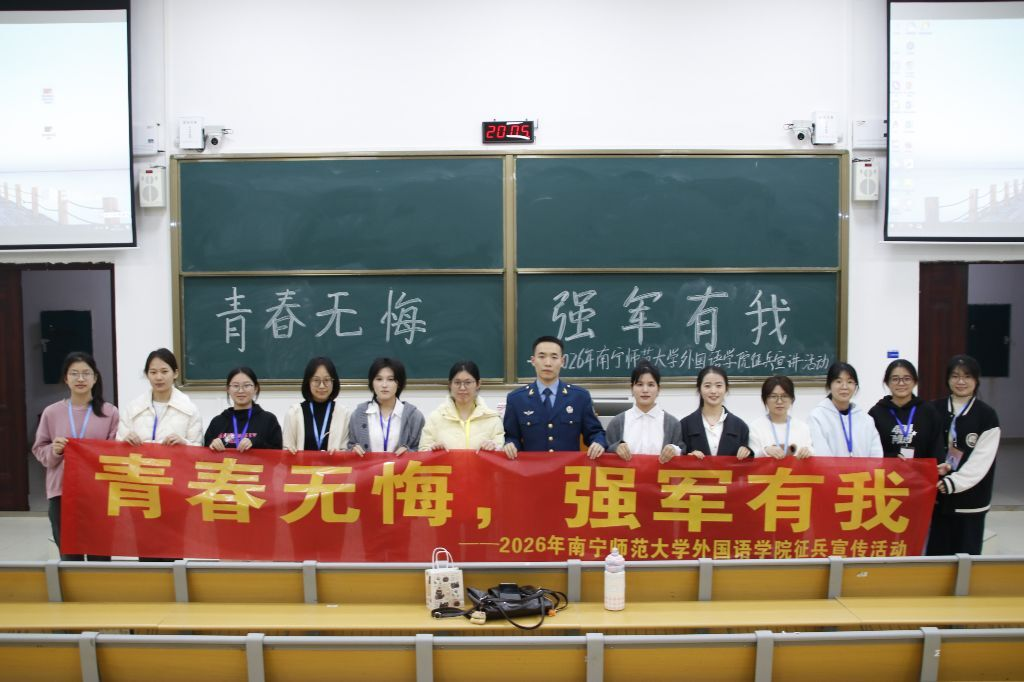 为精准对接2026年春季征兵工作部署要求,充分发挥外语专业人才在国防建设中的特色优势,激发青年学子参军报国的热情,12月16日晚,外国语学院在武鸣校区实验楼1B-113教室顺利举办“青春无悔,强军有我”2026年春季征兵宣讲活动。