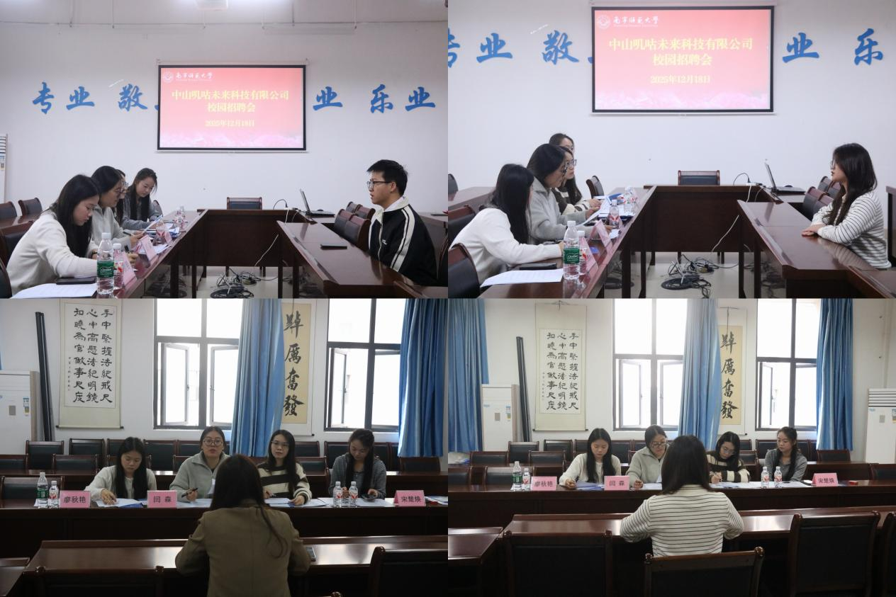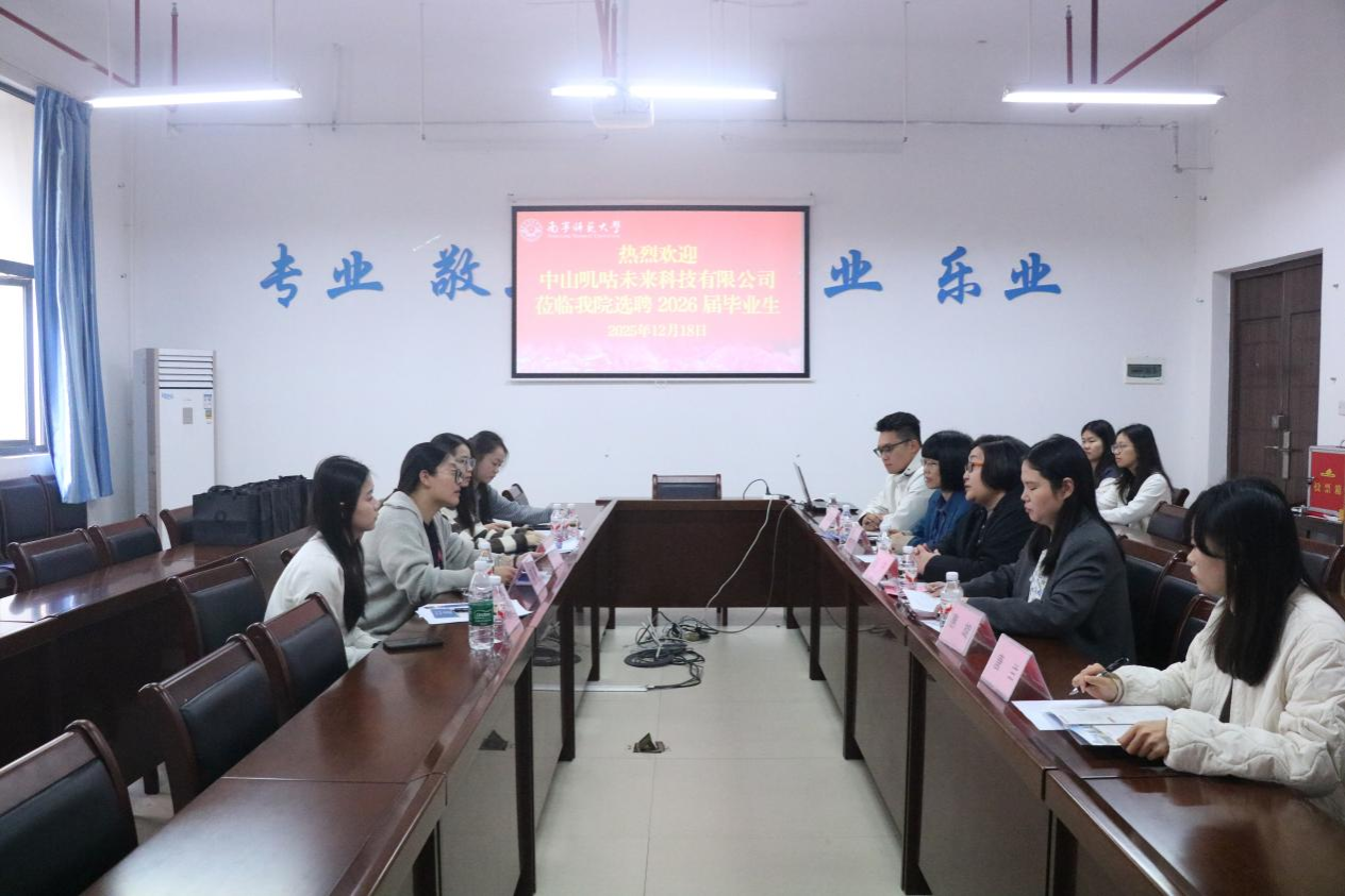 12月18日上午,中山叽咕未来科技有限公司校园招聘会暨2026届毕业生就业双向洽谈会在五合校区理综楼304会议室进行。公司品牌创始人闫森携人力资源团队亲临现场,学院党委书记聂卉、副院长周飞伶,学工办辅导员惠旋、兰浩玮、唐兰以及部分2026届毕业生参加会议。