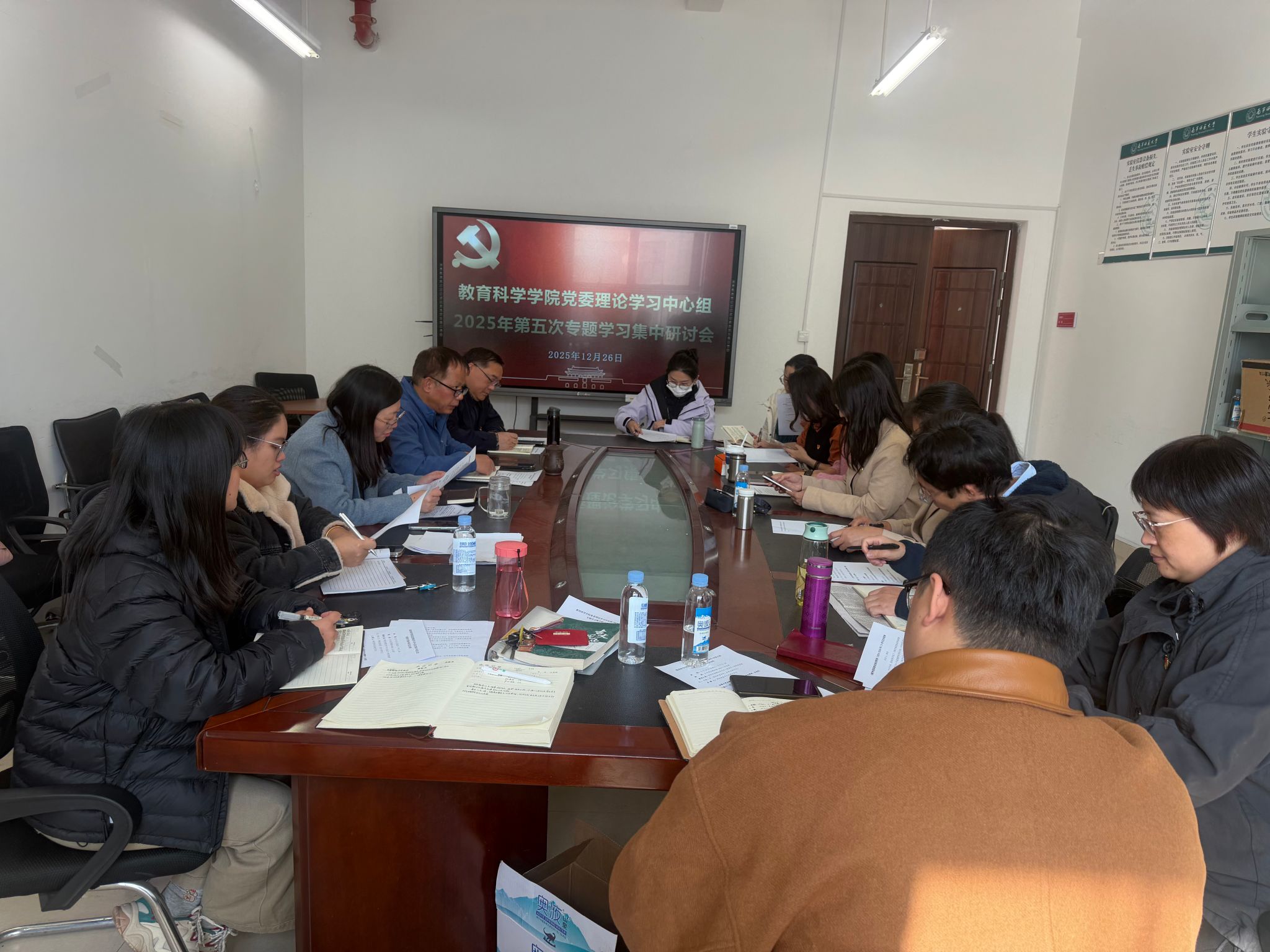 12月26日下午,教育科学学院党委在五合校区理综楼1004-1会议室举行党委理论学习中心组2025年第五次专题学习集中研讨会。学院党委书记余朝文主持会议,学院党委委员、纪委委员及各党支部书记参加会议。