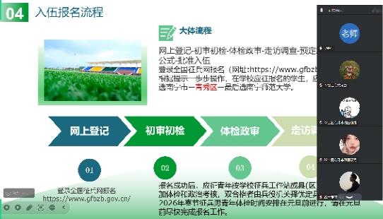 近日,自然资源与测绘学院通过线上平台举办2026年度大学生征兵政策宣讲会,面向全院学生系统解读入伍条件、报名流程及相关优待政策。宣讲会围绕入伍身体标准、报名时间节点、全国征兵网操作流程等内容展开说明,引导学生积极响应国家号召,投身国防事业。