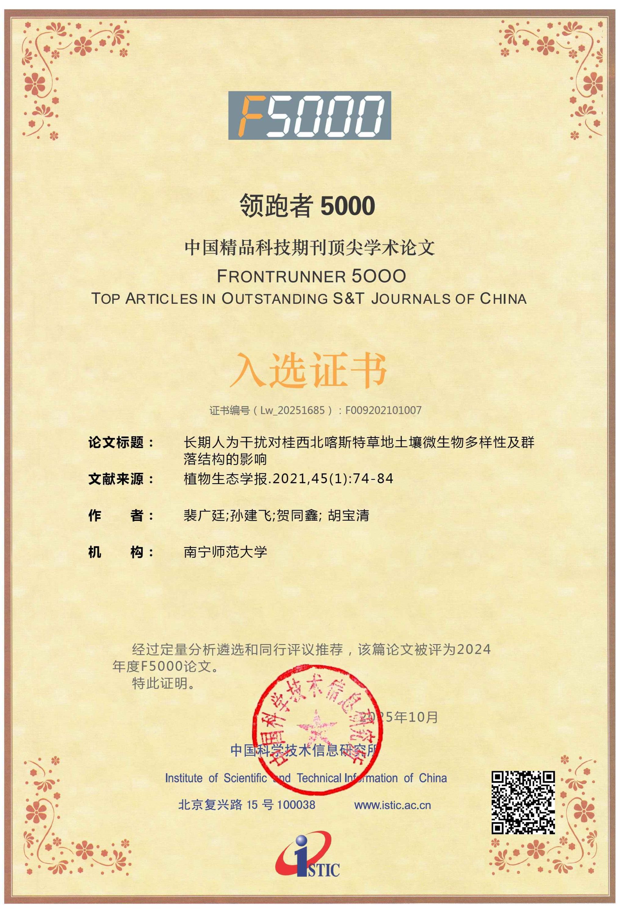 近日,国家科学技术部中国科学技术信息研究所正式发布2024年度“领跑者5000——中国精品科技期刊顶尖学术论文”(F5000)入选名单。问鼎在线(中国)地理与海洋研究院土壤生态过程与石漠化修复团队于2021年发表在《植物生态学报》的论文《长期人为干扰对桂西北喀斯特草地土壤微生物多样性及群落结构的影响》成功入选。该论文同时荣获《植物生态学报》2024年度“优秀论文”,并入选学术精要“高PCSI指数、高被引、高下载”论文榜单,充分彰显了其学术影响力和持续关注度。