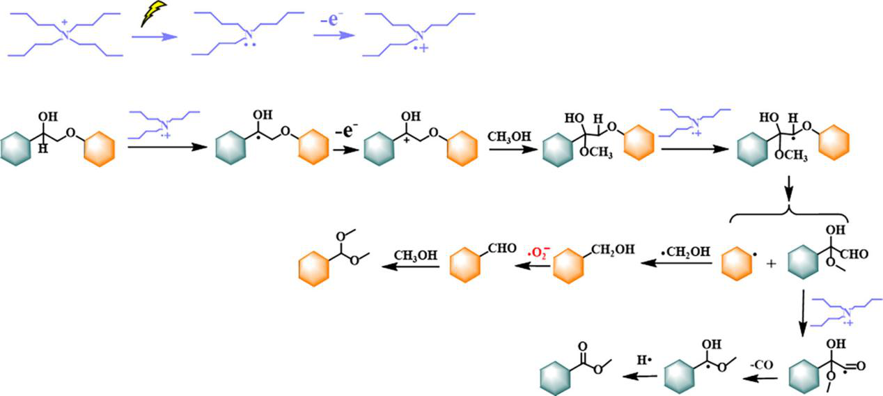 针对传统热化学或催化氧化方法条件苛刻、选择性差、依赖贵金属等问题,该论文创新性开发了一种简单、高效、无金属催化剂的一锅法电催化体系。以四丁基四氟硼酸铵(TBABF₄)在甲醇中同时作为电解质和催化剂,在室温、常压的温和条件下,实现了木质素β-O-4键的选择性断裂,将不稳定的醛中间体原位转化为更稳定、附加值更高的缩醛产物。