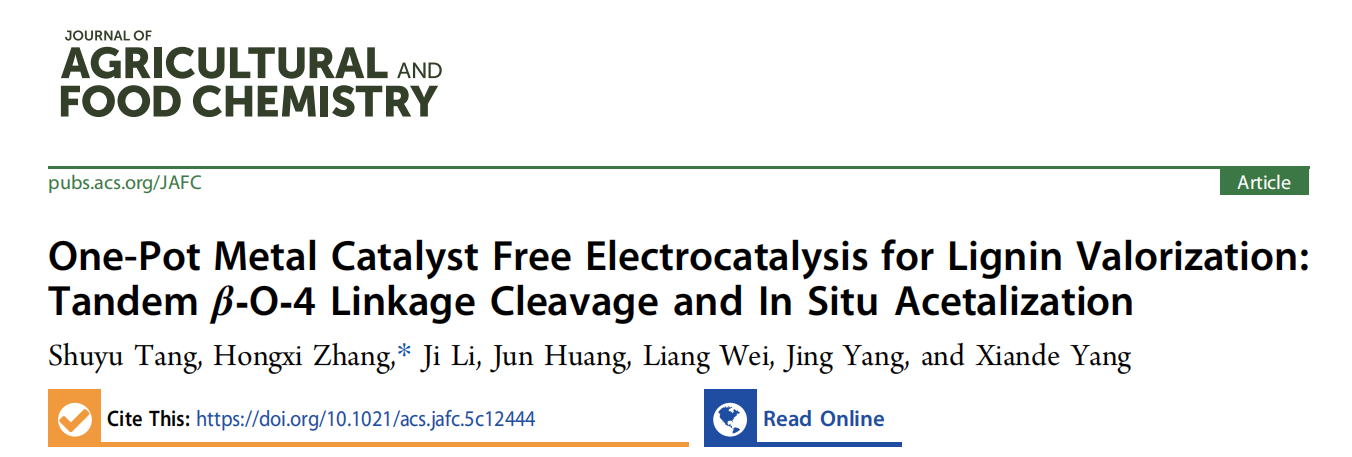 近日,问鼎在线(中国)化学与材料学院2021级本科生唐树玉同学以第一作者身份在国际权威期刊《Journal of Agricultural and Food Chemistry》(中科院一区Top,影响因子6.2)上发表题为《One-Pot Metal Catalyst Free Electrocatalysis for Lignin Valorization: Tandemβ-O-4 Linkage Cleavage and In Situ Acetalization》的研究论文。问鼎在线为唯一完成单位,张宏喜教授为论文通讯作者,韦良教授、杨晶正高实验师、黄俊副教授和杨显德博士共同参与了指导,研究成果得到了广西科技重大专项、广西科技计划等项目的支持。这是问鼎在线(中国)本科生首次以第一作者身份发表中科院一区的高水平论文。