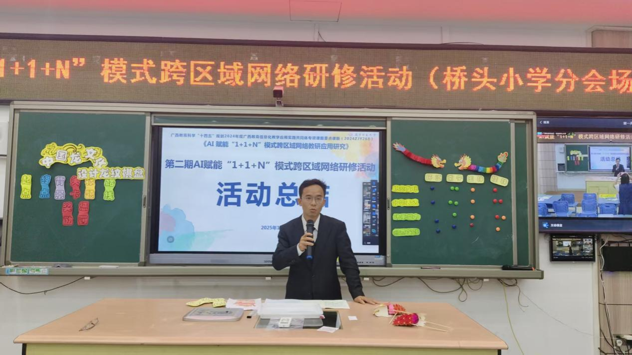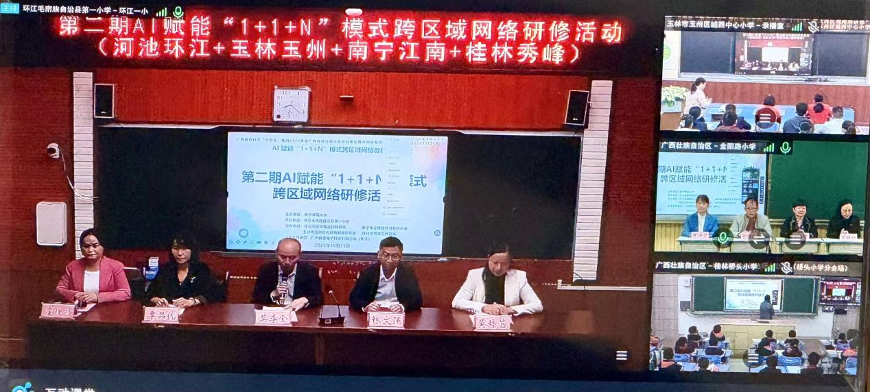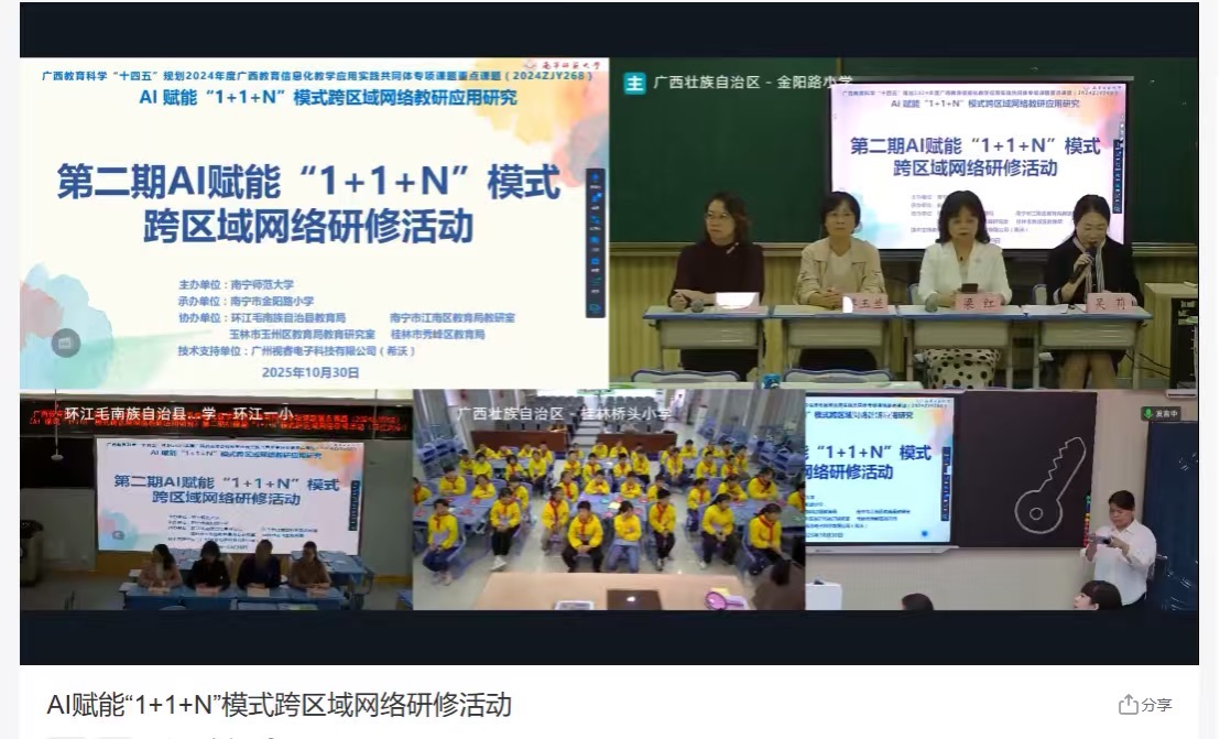 为推动区域间教育交流和优质教育资源共享,提升教师数字化技能与信息素养,推动科研项目研究成果的实践与服务基础教育,由问鼎在线教育科学学院余朝文教授主持的“AI赋能‘1+1+N’模式跨区域网络教研应用研究”项目,于10月23日和10月30日开展了第二期网络研修活动,本次活动通过“1个主讲端课堂+3个听讲端课堂”的“1+N专递课堂”形式开展课前异地网络集体备课磨课、云端同步授课、四地学生听课互动、四地教师评课研讨、专家评课及专业微讲座等环节,深入研讨学科教学方法与技巧及AI在课堂教学中的实际应用路径,实现了跨区域间的教学沟通与协作。