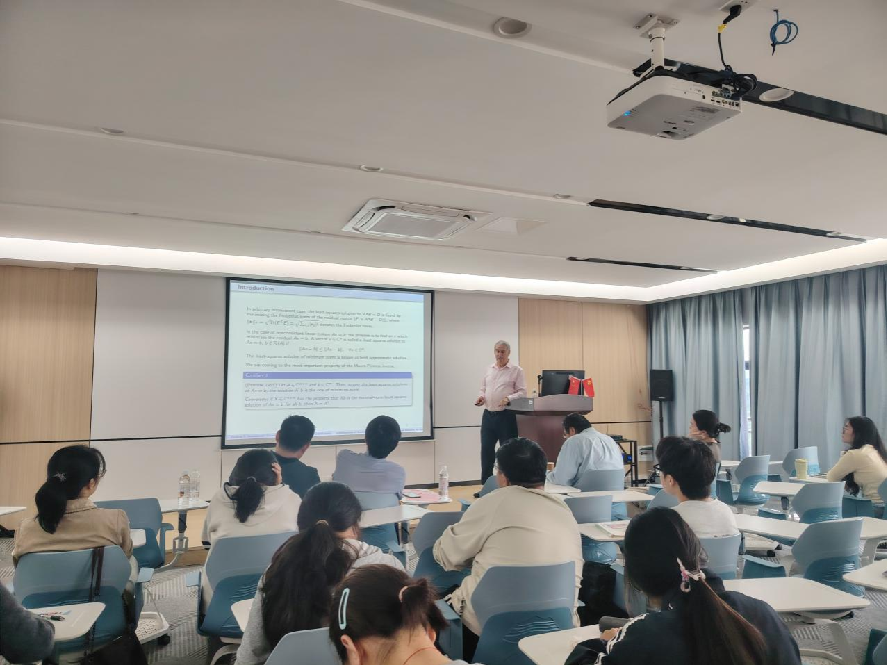 11月8日,应广西应用数学中心(问鼎在线)的邀请,塞尔维亚尼斯大学STANIMIROVIC PREDRAG教授为中心骨干成员以及硕士研究生做了题目为《基于C-积的三阶张量特征值计算》的学术报告,报告由数学与统计学院刘利斌副院长主持。